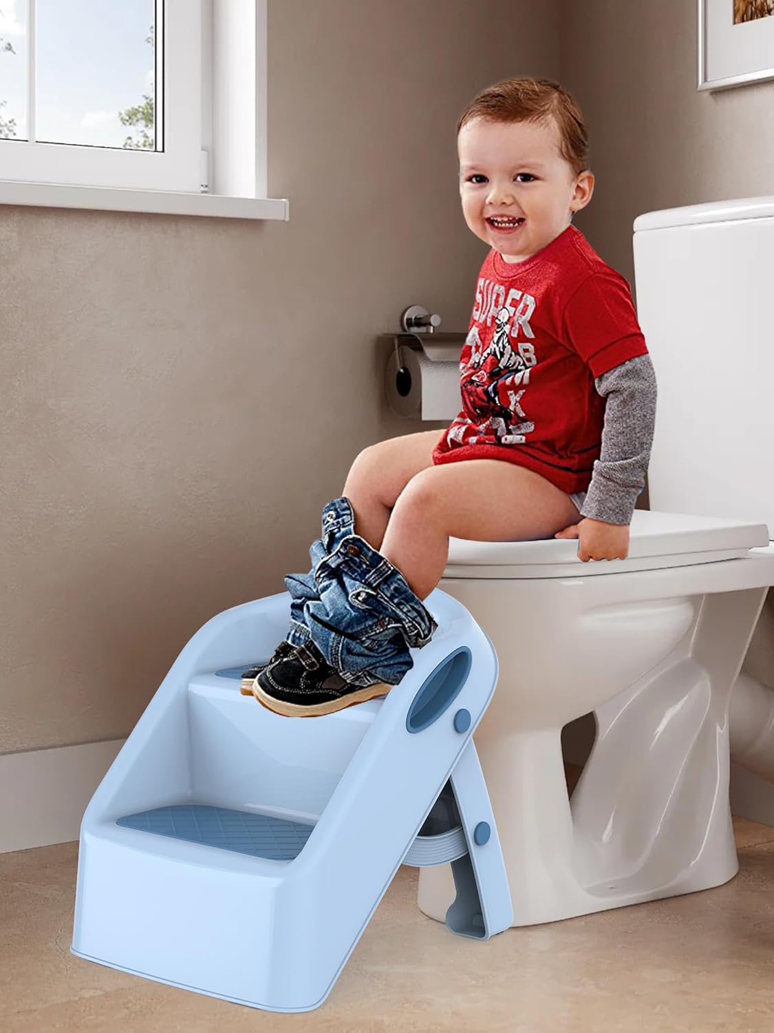 Повдигнатите дръжки осигуряват допълнителна безопасност и предотвратяват падания, а широките стъпала позволяват стабилно стъпване. 🧒 Вашето дете може безопасно да използва стъпалцето без риск от подхлъзване.